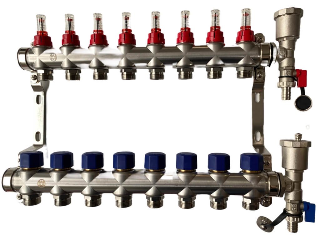 Kvalitný nerezový 8-okruhový rozdeľovač na teplovodné podlahové kúrenie s vypúšťacím ventilom a automatickým odvzdušňovacím ventilom.